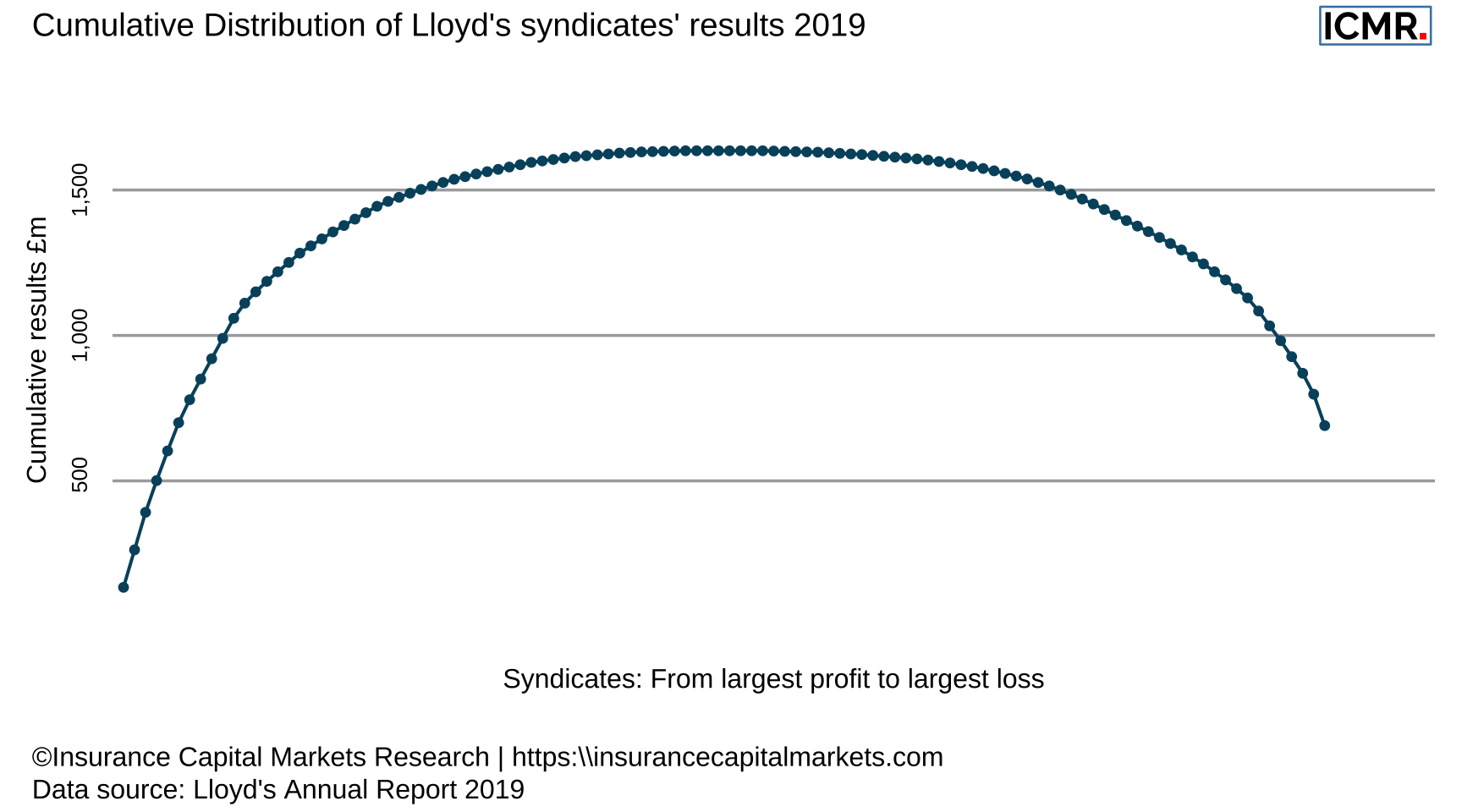The aggregated result of all profitable syndicates amounted to £1,635m, while the aggregated loss of the remaining syndicates was -£945m. Well, as the old underwriter says, the picture always looks much rosier without the loss making business.
