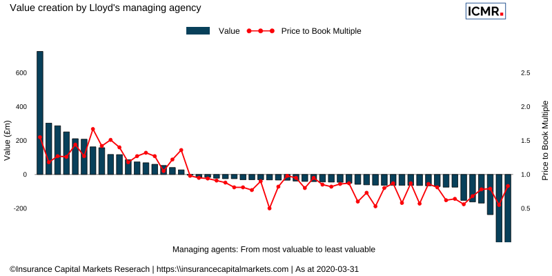 What we can see on this chart is a balance between managing agencies creating value and those with book value multiples of less than 1.0x, bringing the average of the market as a whole to 1.0x. The fact that the red line zigzags is because biggest isn’t always best over the long term and some smaller managing agencies have higher multiples and have therefore created more value than larger agencies.
