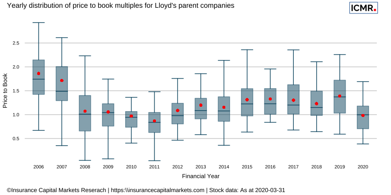 The chart below shows the range of prices to book for all the publicly listed companies which owned Lloyd’s managing agencies during the years shown of 2006 to 2020.