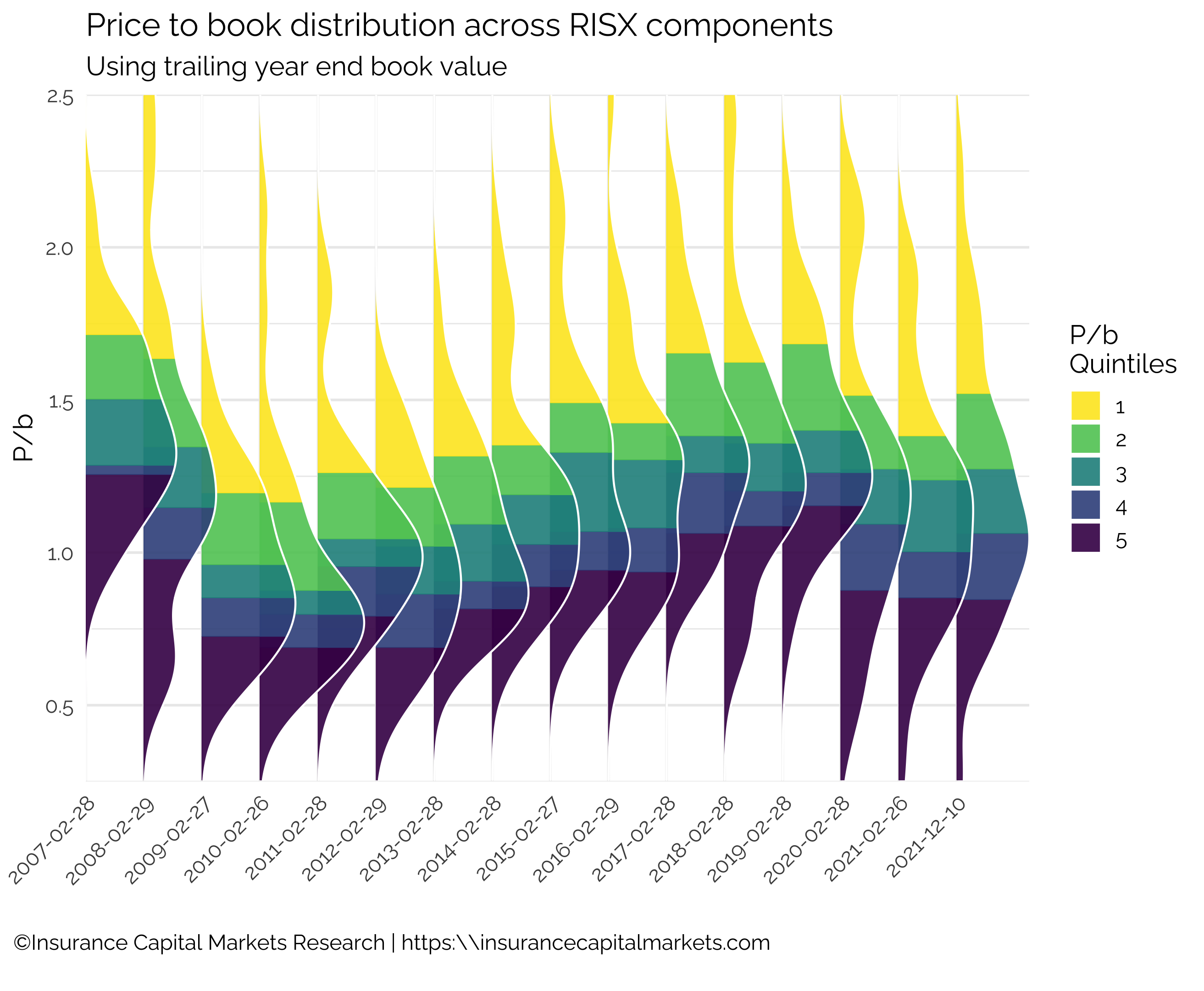The price to book (P/b) multiples of the RISX index companies over time provides a sensible comparison to look at deals in the specialty (re)insurance sector and Lloyd’s in particular.