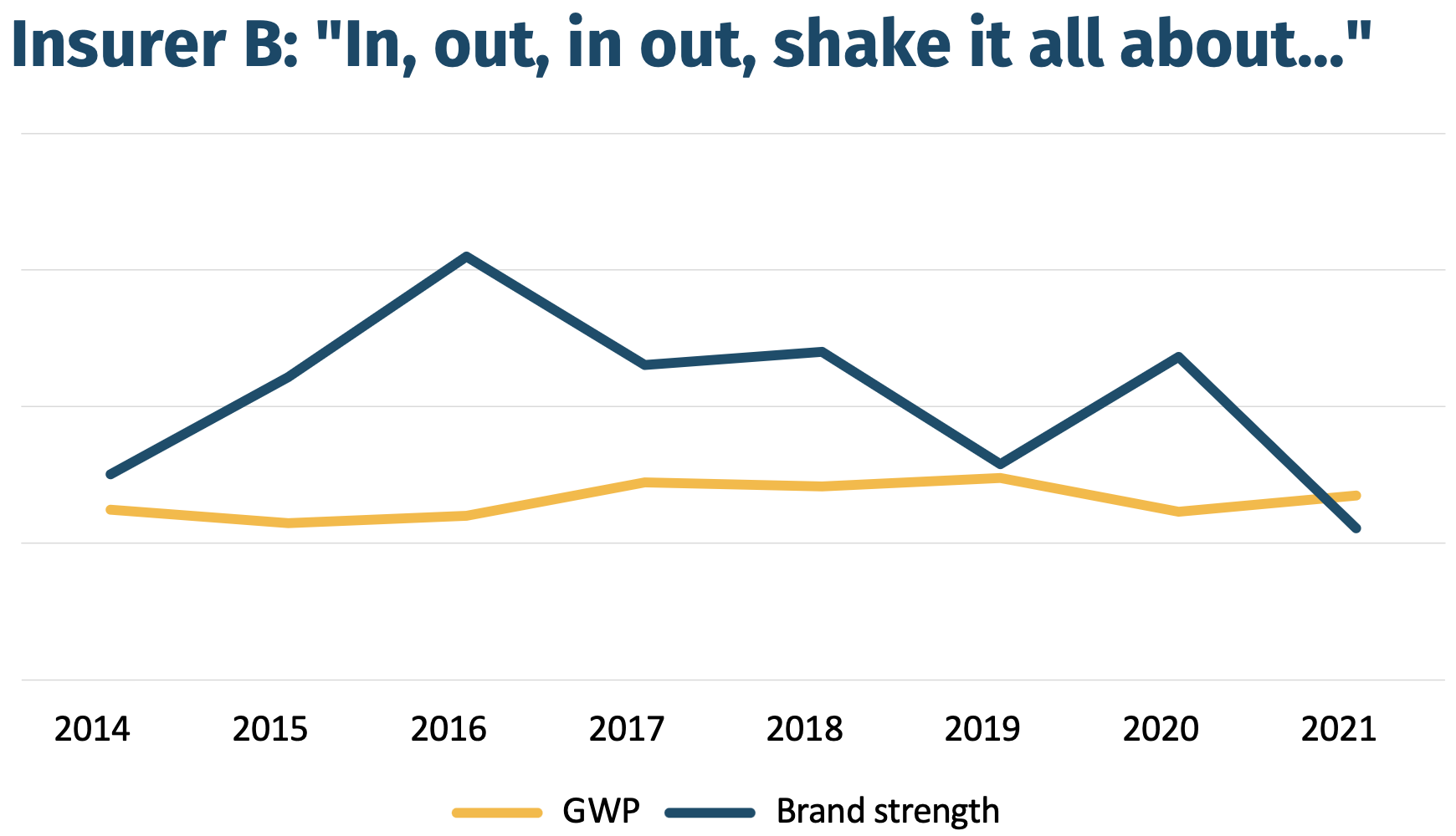 This is the London Market business of a large global player - the brand has been volatile with premium stable, but in a hard market where competitors are achieving better growth. It is likely that a more consistent brand build would have resulted in better growth in line or ahead of the market. This example is also interesting because the brand is a ‘household’ name meaning that it would have been cost-effective to build brand familiarity in London.