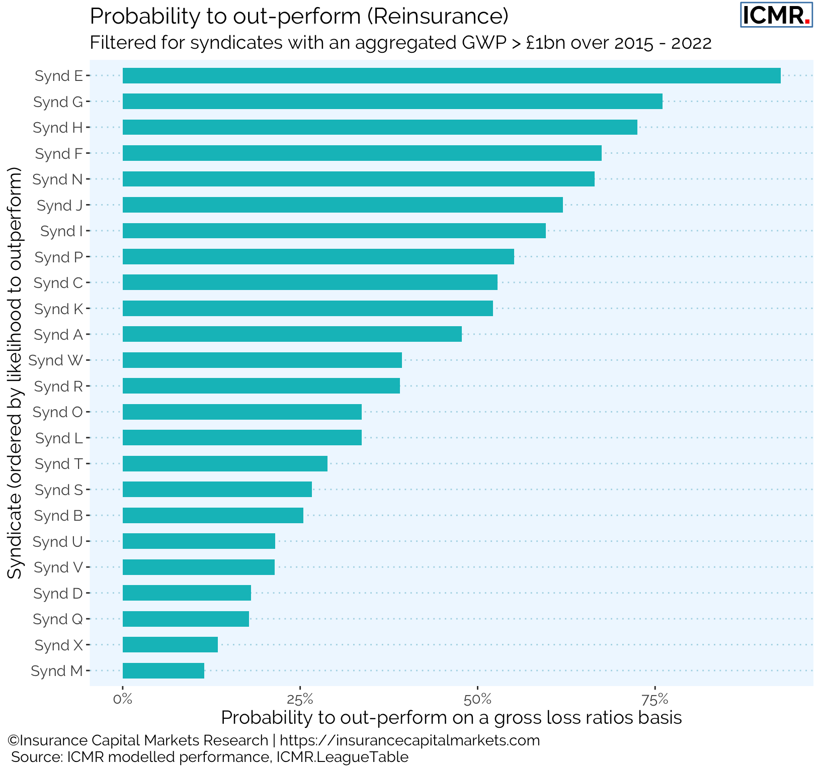 Follow-only strategies will tend only to focus their analysis on gross underwriting, leading to their own questions of how best to purchase reinsurance protection. Given the consistency of syndicates’ relative performance, ICMR developed a model that assess syndicates’ probability of outperforming the market for prospective periods. The chart below does just this: