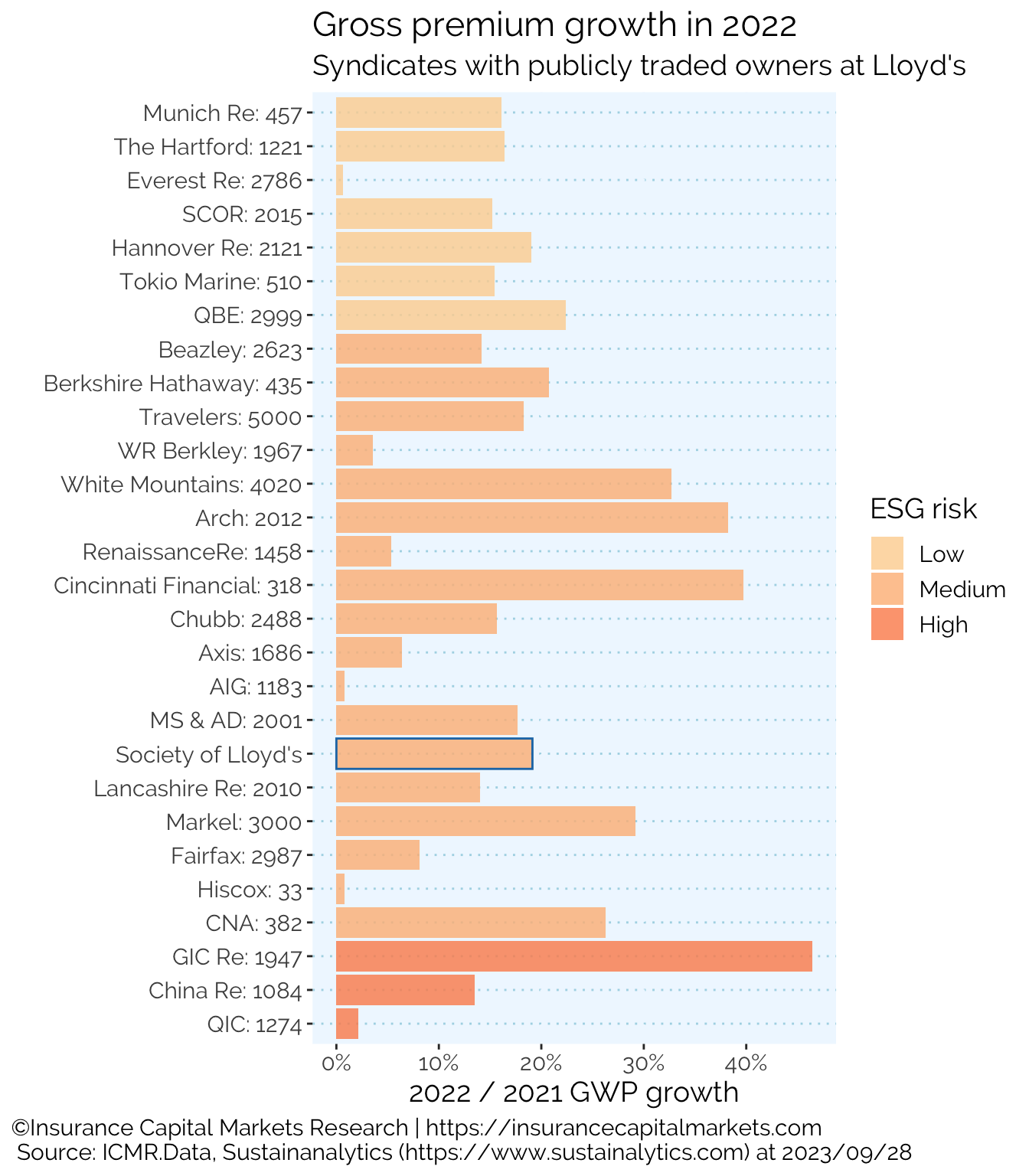 The parental ESG rating appears to have little bearing on Lloyd’s authorisation to grow syndicates’ premium footprints, with some of the largest percentage growth being granted to syndicates whose parents have publicly available “high risk” ESG ratings. Given the importance of listed (re)insurance companies to Lloyd’s capital, it does suggest the Corporation’s current hierarchy has yet to develop a holistic approach to ESG across all dimensions of the market.