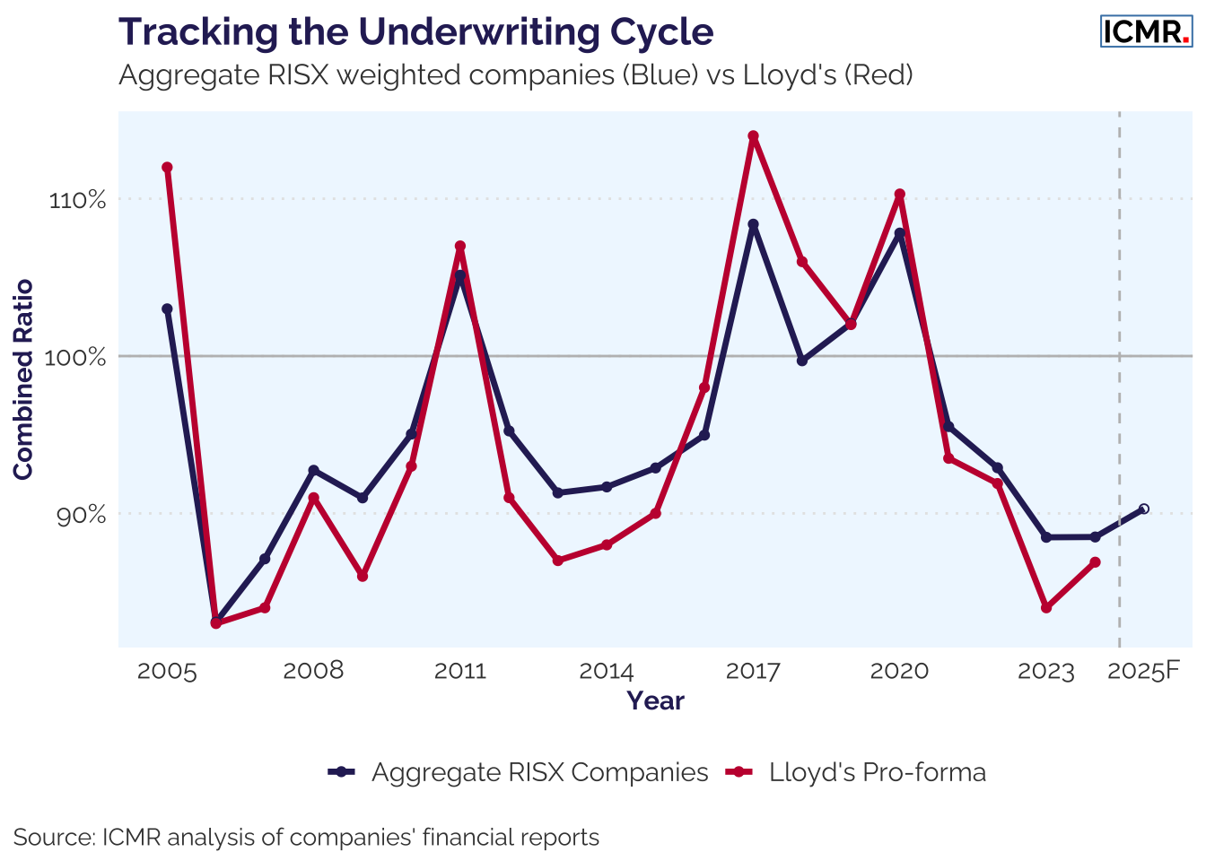 ICMR’s latest analysis of the global specialty (re)insurance market indicates a banner year for Lloyd’s of London. Based on the reported results of the RISX index constituents to date (17 out of 27 companies), ICMR is projecting a combined ratio of below 90% for the marketplace in its upcoming 2025 results.