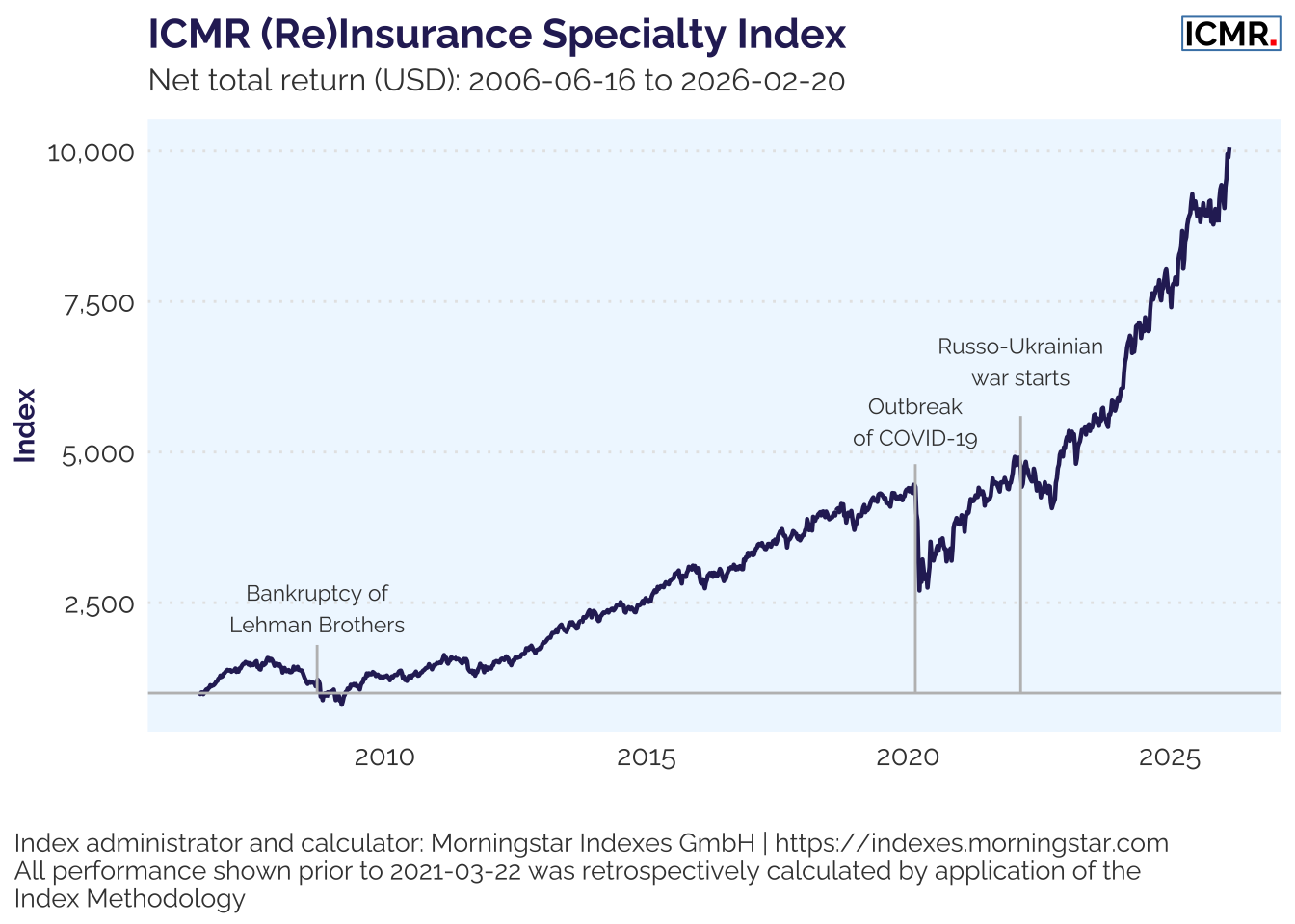 While broader equity markets have seen a muted start to the year, the specialty sector is surging. The RISX index is up 6.9% YTD (as at 20 Feb 2026), significantly distancing itself from both general and sector-specific insurance benchmarks: