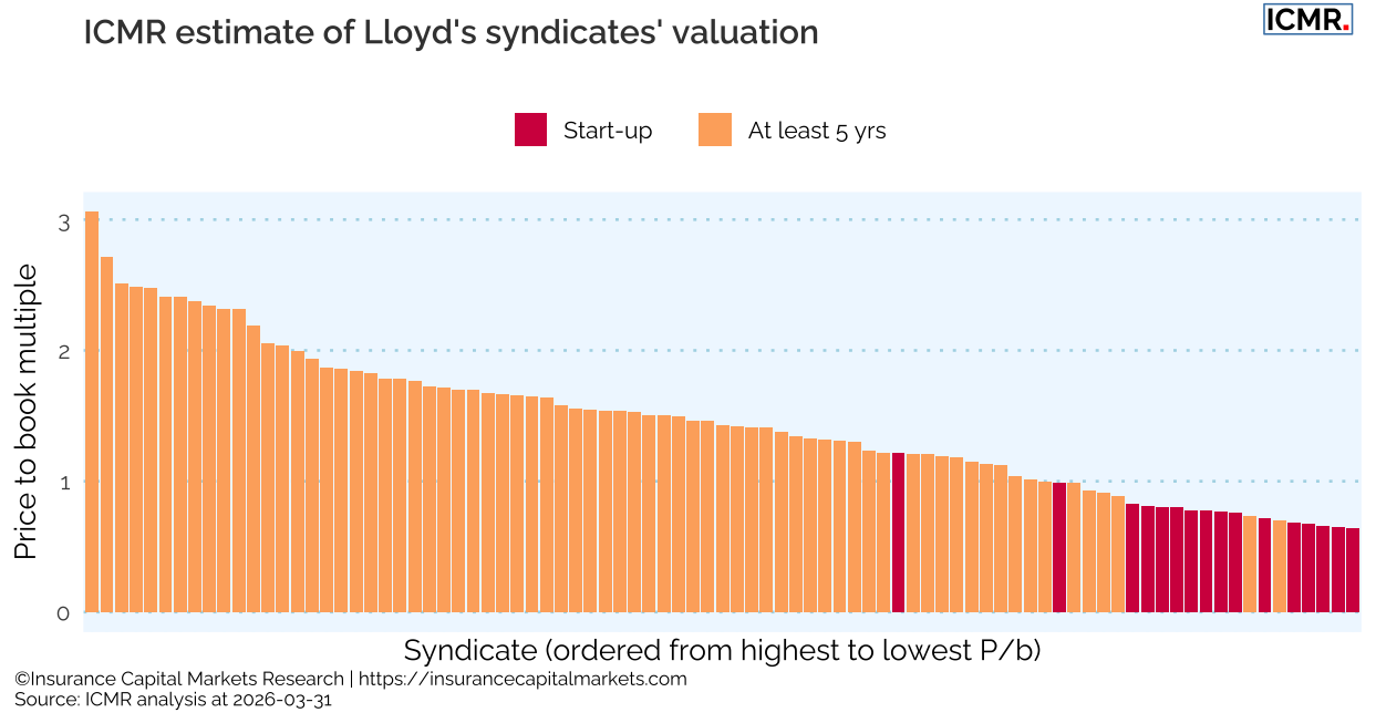 ICMR estimate of syndicate price to book (ECA) valuation as of 31 March 2026. All ECA numbers are estimated by ICMR as if for whole syndicates; no account taken of member level capital.
