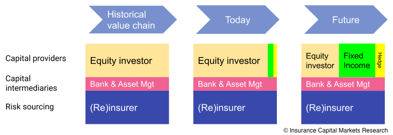 ICMR believe that there will be an evolution of insurance risk capitalisation. Where in the past most of the capital was equity from shareholders or members in the case of mutuals or Lloyd’s syndicates, we will see the fixed income market participate to a much greater extent in capitalising risk, making insurance more capital efficient.