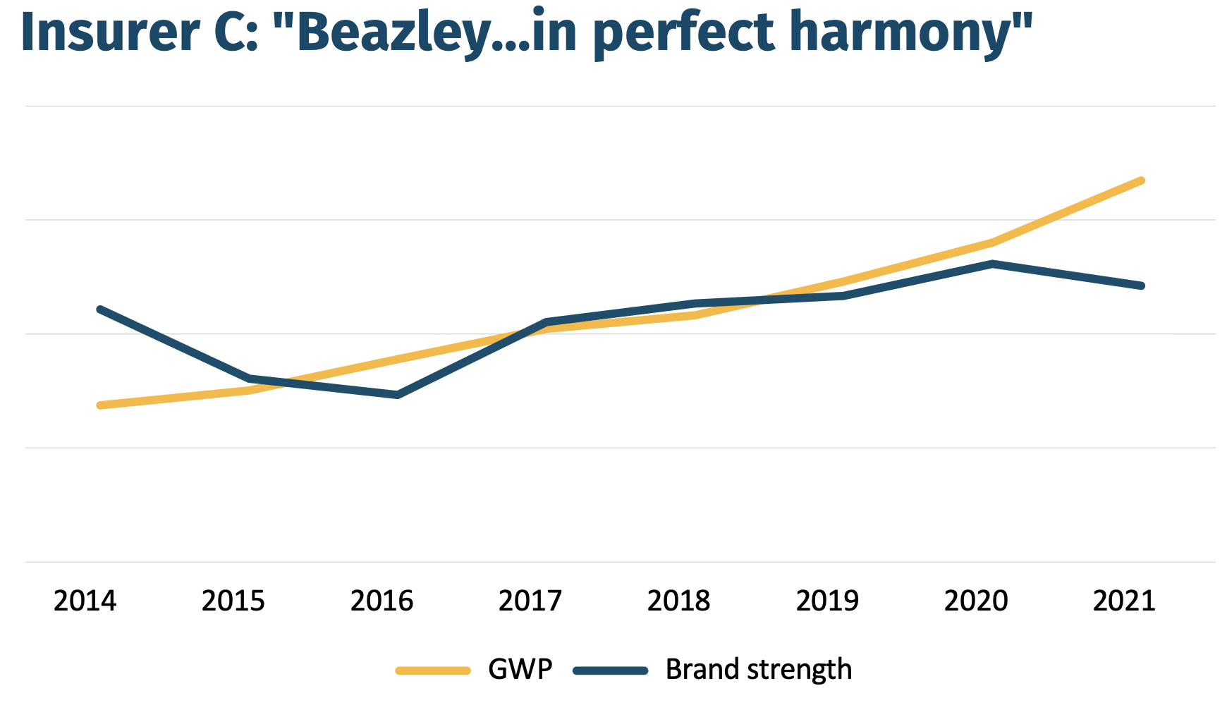 Beazley has created strong positive alignment between brand strength and GWP growth. This potent combination is the result of investment in sophisticated marketing and application of consistent values and service delivery over a long period. Notably Beazley was also the #1 Insurindex London Market Powerbrand in 2022.