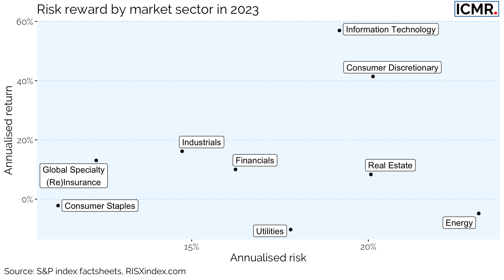 Reviewing the index composition in a little more detail shows the reward versus the risk underlying each sector. Whilst global specialty (re)insurance may only have generated the fourth largest mean return in 2023, it did so with a much lower risk (defined as the annualised risk from the daily volatility of capital markets pricing).
